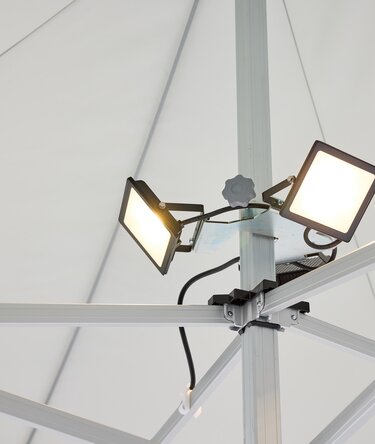 2. Align the LED spotlights independently and only then connect them to the power supply. The cable must run over the cross poles of the tent structure.