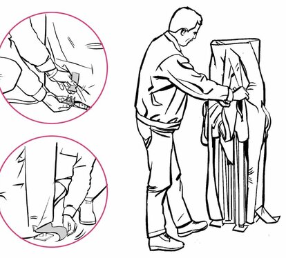 Raise one leg, press the spring button on it and push the upper leg down. Repeat for all 4 legs