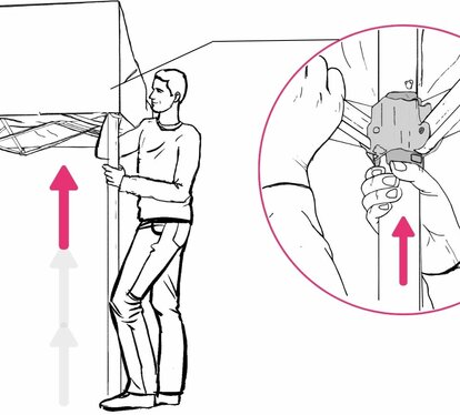 Hold the tent leg firmly with your foot and push up the corner scissors until the spring-loaded pin clicks in, repeat the same operation in all 4 corners. The roof will rise automatically.